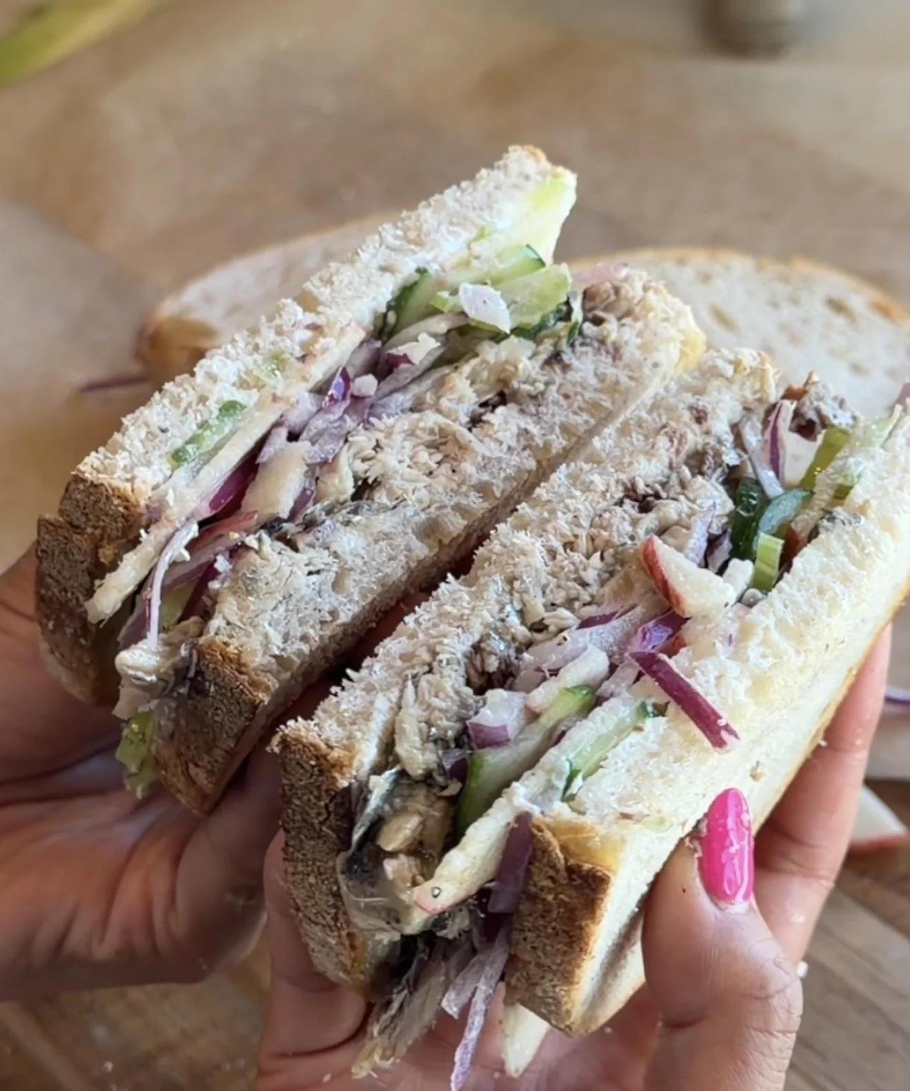 After the bread is toasted, spread greek yogurt or mayo. Top one side with sardines and the other with the marinated salad. Slice in half and ENJOY!!! It’s especially good with pickles.